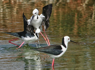 I watched an unusual behaviour today by some Black-winged Stilts. I don't know why they were behaving the way they were, maybe it is mating season, or maybe they were just mucking around, but I haven't witnessed this sort of behaviour at any time previously. There was a lot of squawking involved, and quite a few times some of them were dunked underwater.