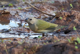 And then the party started. At first it was just Double-barred Finches, then the Long-tailed Finches joined in, followed by a brief glimpse of a Gouldian Finch adult, then Zebra Finches, all the while being constantly sent packing by the Brown , Banded , Grey-fronted, Yellow-tinted and Rufous-throated Honeyeaters, not to mention the Willie Wagtails and Magpie Larks. And then there were the pigeons and doves - Bar-shouldered, Peaceful and Diamond Doves all arrived, Common Bronzewings, Crested Pigeons, the bird list just kept growing. I managed a few decent shots of the three finches in the title. Here is a sample: